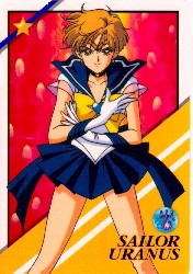 As Sailor Uranus, she takes a more serious turn. She is utterly devoted to her mission, and is willing to sacrifice her and her partner's life ( Although she cares for Michiru greatly ) if it would save the universe. She also possesses the first talisman; the Space Sword.